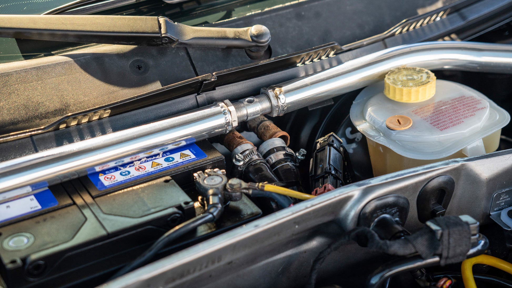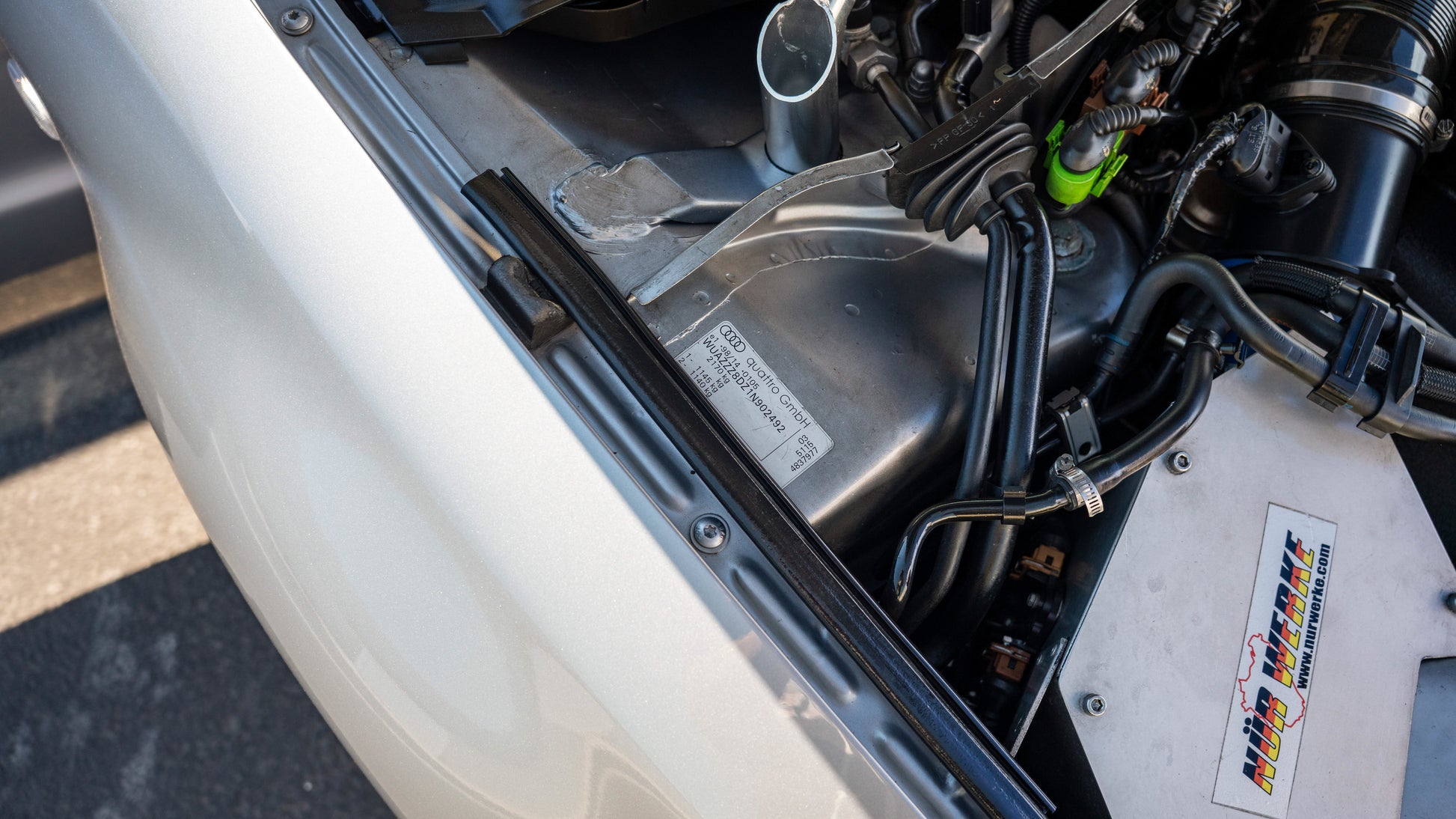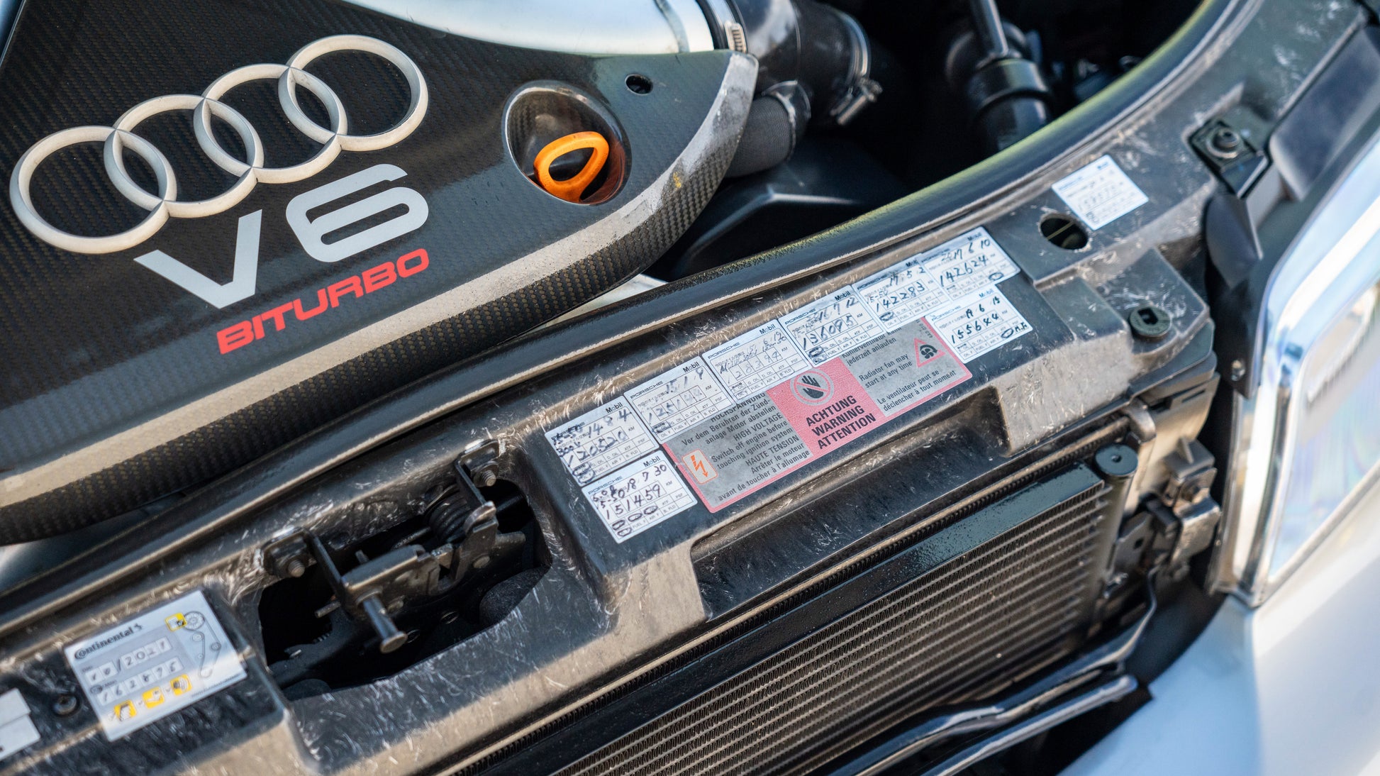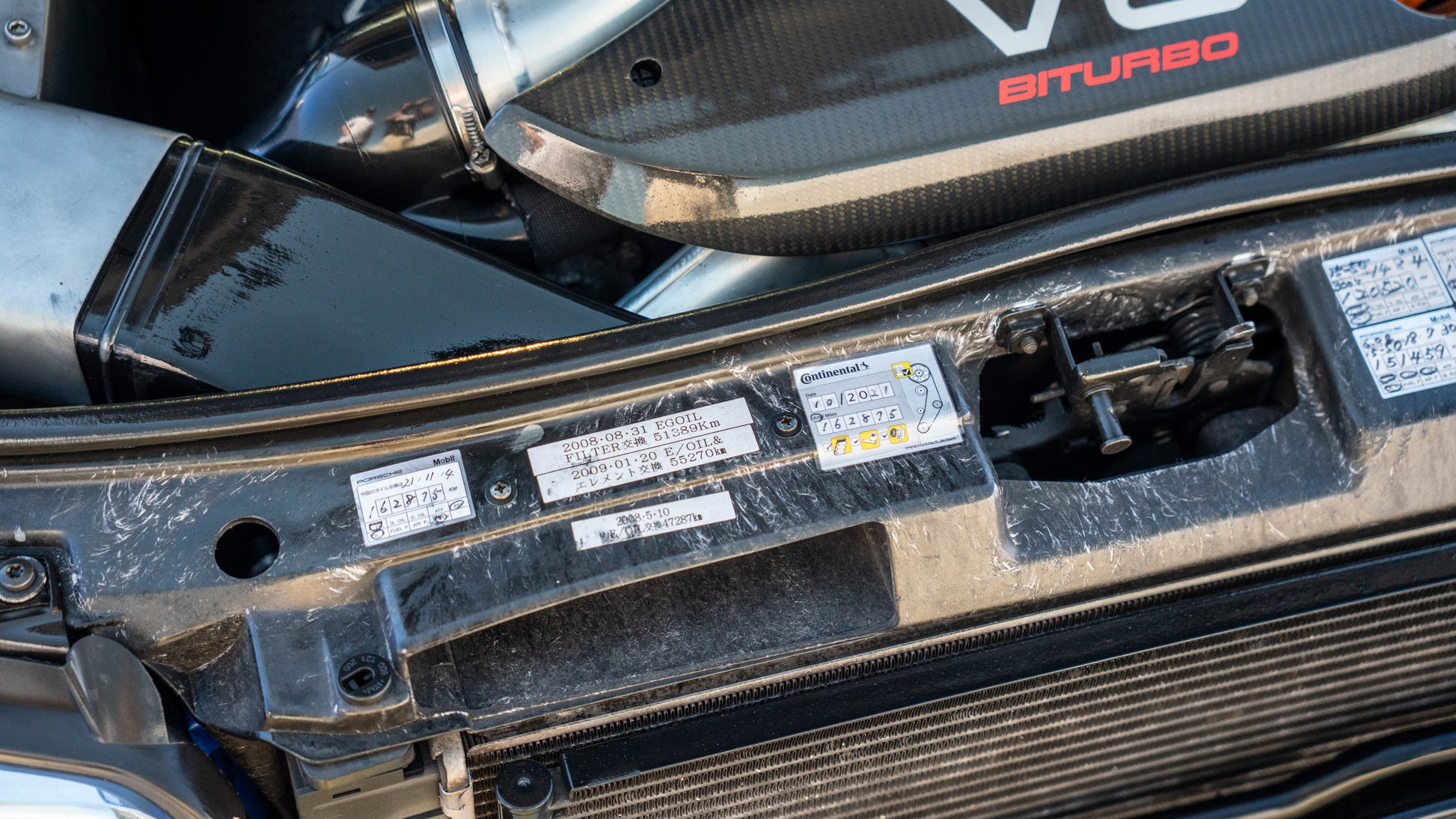 Multiple maintenance stickers present under the hood on the core support, indicating consistent upkeep